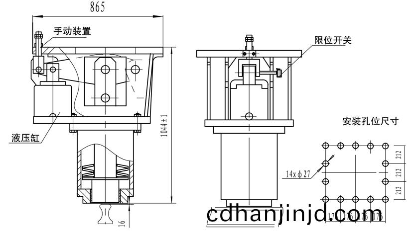 主(zhu)要設(she)計(ji)特點: 常閉式(shi)設(she)計(ji)、採(cai)用液(ye)壓(ya)站集(ji)中(zhong)驅(qu)動(dong)控製(zhi)以(yi)特製碟形(xing)彈(dan)簧實(shi)現頂(ding)軌製動(dong); 摩(mo)擦(ca)塊(kuai)採(cai)用先進(jin)的高耐(nai)磨鋼(gang),性(xing)能(neng)可靠(kao); 設有限(xian)位(wei)開(kai)關(guan),顯示工作狀態(tai); 帶手(shou)動釋(shi)放(fang),安(an)裝維(wei)護(hu)方便。