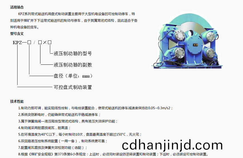 KPZ係列(lie)製(zhi)動器主(zhu)要(yao)用(yong)于(yu)下(xia)運(yun)帶式輸送(song)機(ji)或(huo)大(da)傾角上(shang)運(yun)式輸(shu)送(song)機等大(da)型(xing)機電(dian)設(she)備(bei)的(de)可(ke)控(kong)製動(dong)與(yu)停車,